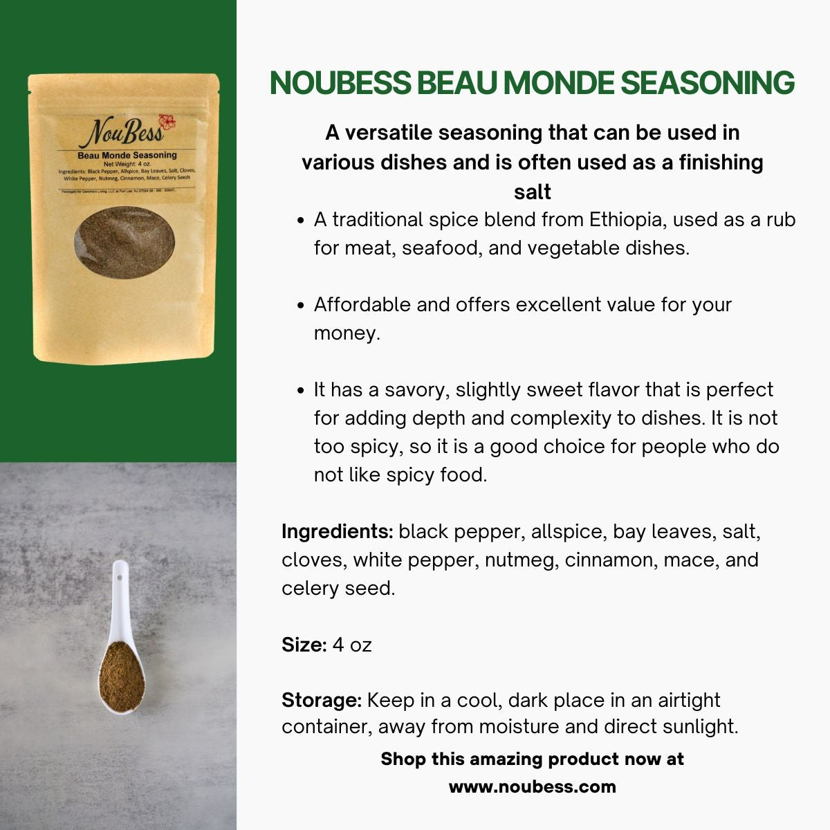 Beau Monde Seasoning is a blend of herbs and spices typically used to flavor meat, poultry, and vegetables. It is a versatile seasoning that can be used in various dishes and is often used as a finishing salt.